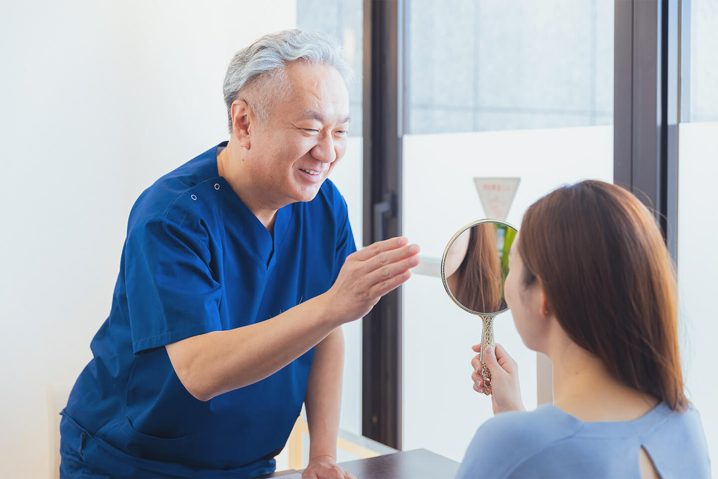 他院では、カウンセリングはスタッフのみ、診察と施術を別々の医師が担当する、といったことも珍しくありません。しかし当院では、カウンセリング・診察から施術、アフターフォローに至るまで、30年以上の診療経験を持つ日本美容外科学会認定の美容外科専門医の院長が、責任を持って対応させていただきます。